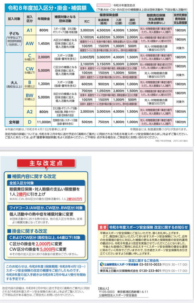 令和8年度 スポーツ安全保険料改定のお知らせ